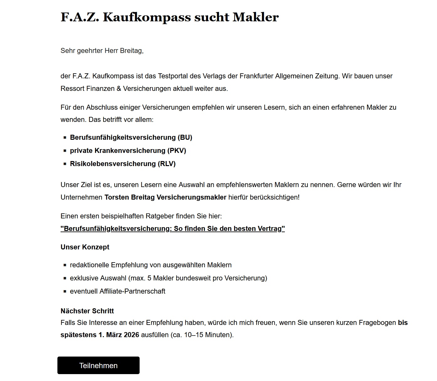 Ich bin Versicherungsvermittler und vermittle Berufsunfähigkeitsversicherungen. Entsprechende Rechtsdienstleistungen im Einzelfall für nicht-Bestandskunden sind Aufgabe der entsprechenden Berufe.