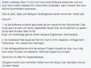Es findet via VersDiagnose also zunächst eine vollständige Risikoverschiebung vom Versicherer auf Kunden und Makler statt. Zeigt man dem Versicherer mit einer ganz normalen Risikovoranfrage die Umstände an und tippt dann dessen Mitarbeiter in ein solches Tool ein, können Kunde und Makler für diesen Fehler nicht zur Rechenschaft gezogen werden